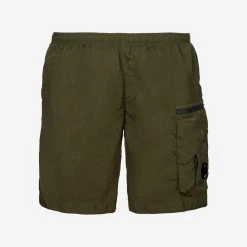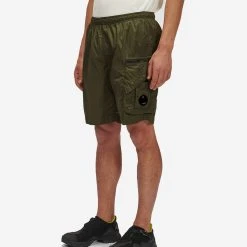 Nylon dyed utility shorts constructed with an elasticated drawstring waist and secure leg compartments with a Lens detail. Chrome is C.P. Company’s foundation woven multifilament nylon. This new version uses Econyl® regenerated nylon yarns, created through the upcycling of fishing nets.