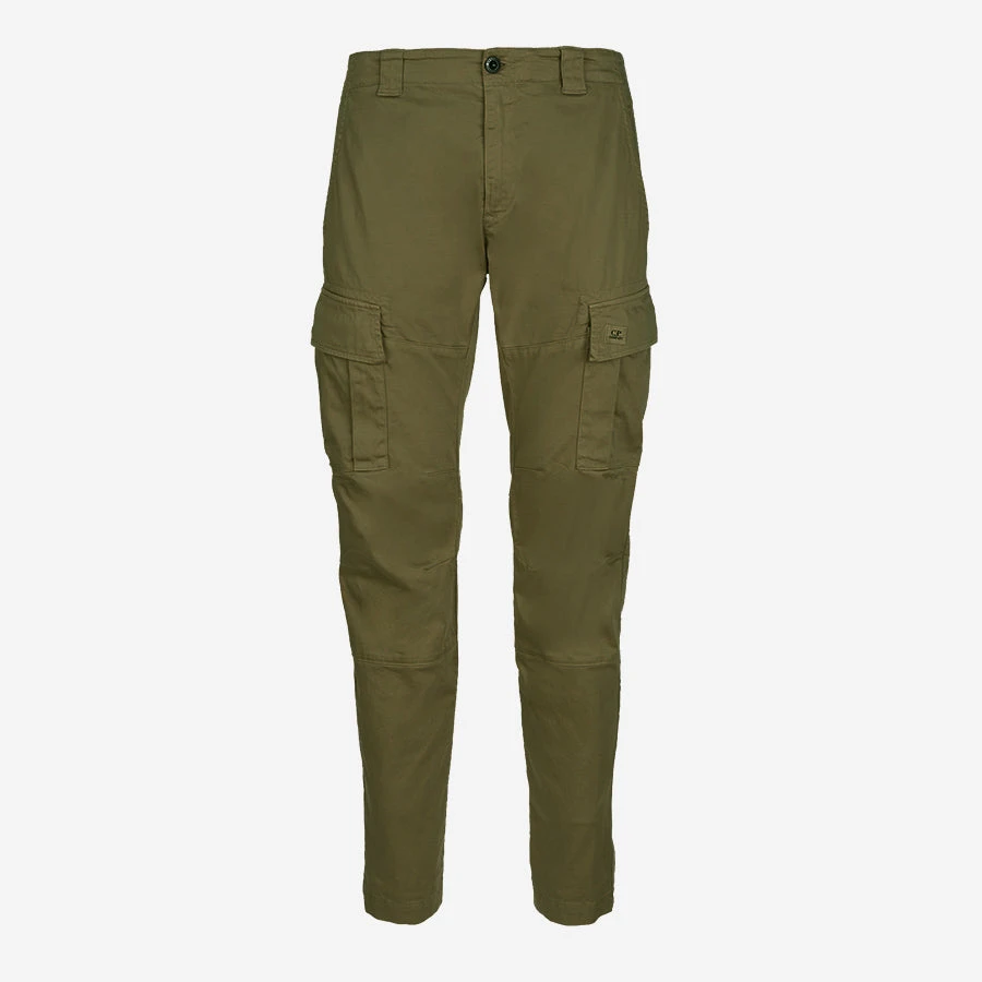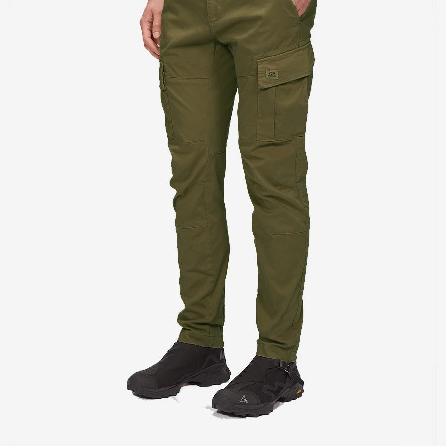 Functional cargo pants crafted in an ergonomical fit featuring belt loops, zip fly and button fastening and slanted hand pockets. Completed with two back pockets and two cargo flap pockets and finished with a C.P. Company logo detail. Engineered in lightweight Stretch Sateen, a matte cotton textile with built-in extensibility, for a flexible and durable fit. Garment dyed for an increased chromatic depth and intensity throughout.
