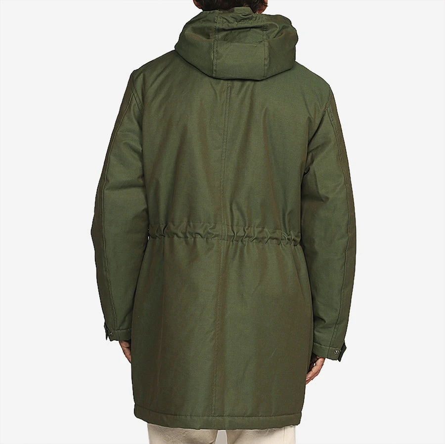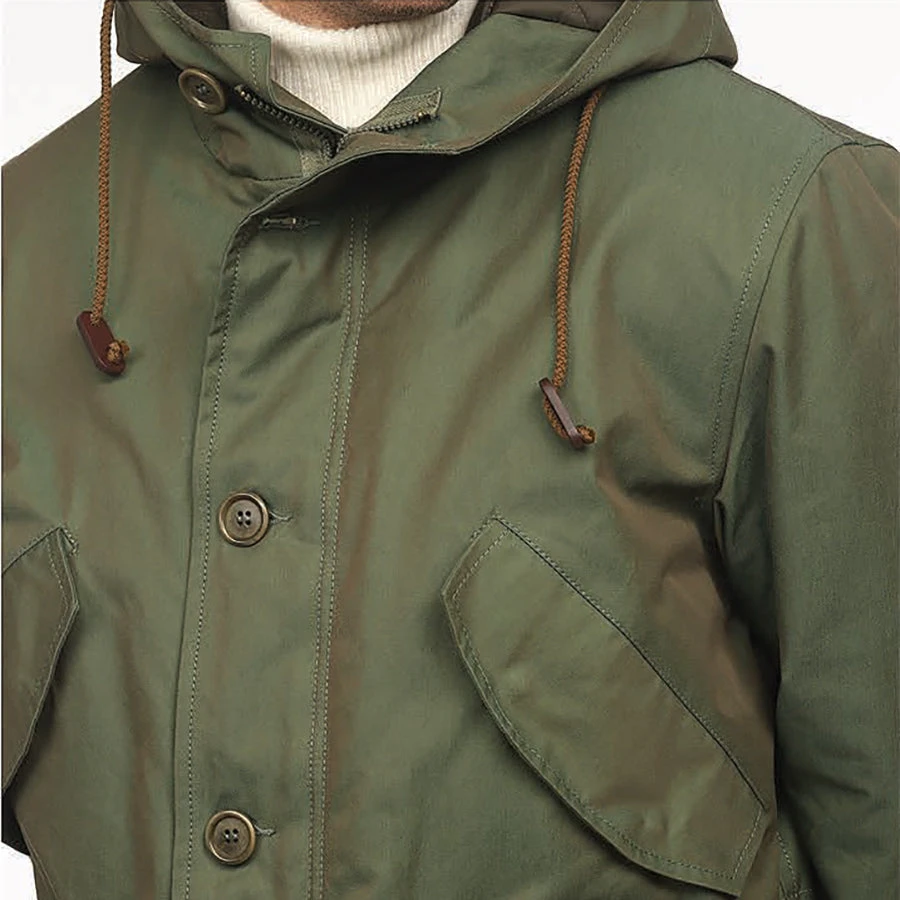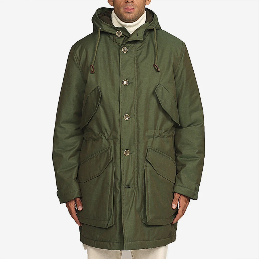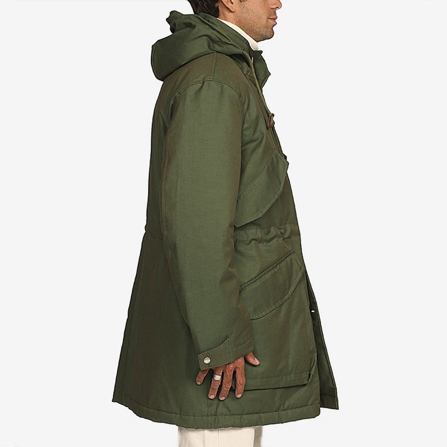 The Boston Army Parka offers comfort, free range of motion and a complete protection against the wind, water and moisture and is excellent for hiking, travel and everyday wear. Finished in a waterproof resin cotton, the parka features a high collar with an adjustable hood, sturdy, two-way front zipper with buttoned weather resistant flap for added protection and adjustable cuffs. Two front snap button flap patch pockets provide ample storage for your belongings while the two upper chest snap button flap pockets keep your hands warm. A brimmed hood with adjustable cord via stoppers keeps you protected from the elements while the internal adjustable cord provides shape and helps prevent wind from riding up the inside of the jacket.