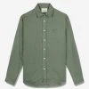 - Block colour collar, sleeves, placket and hem