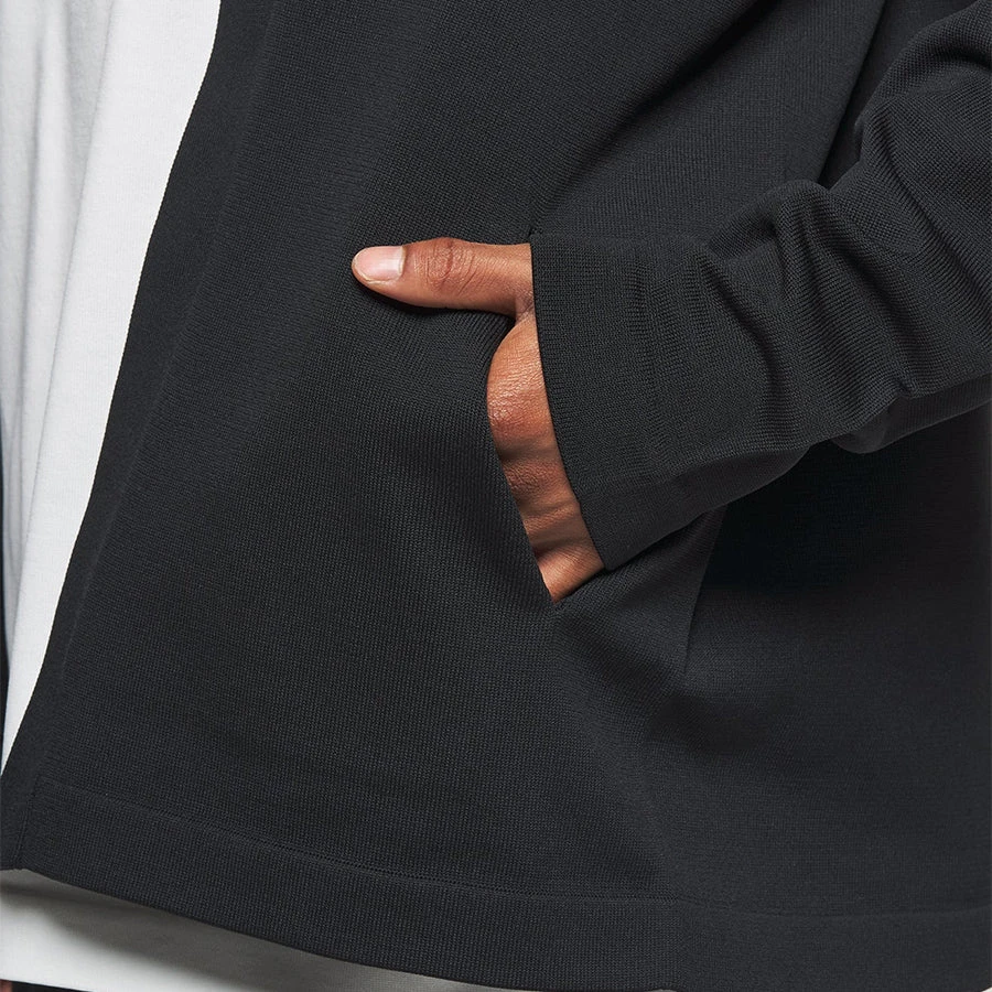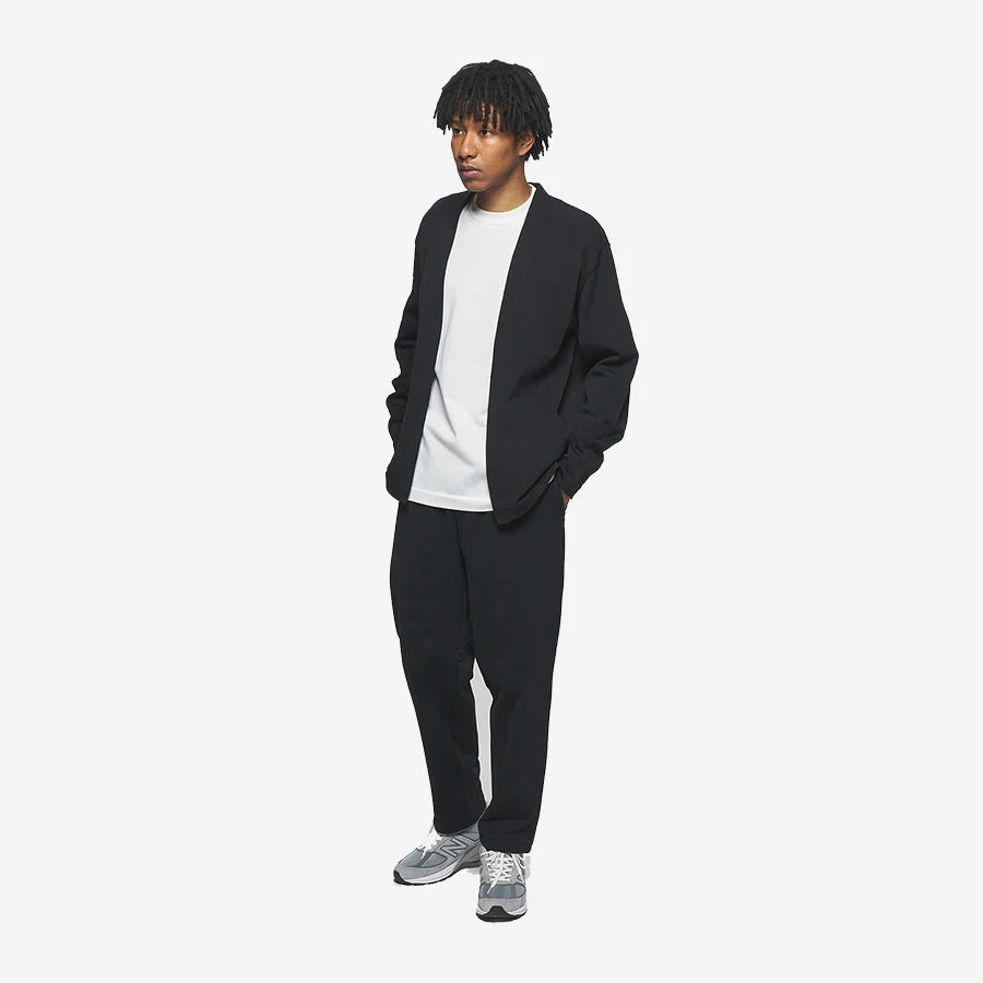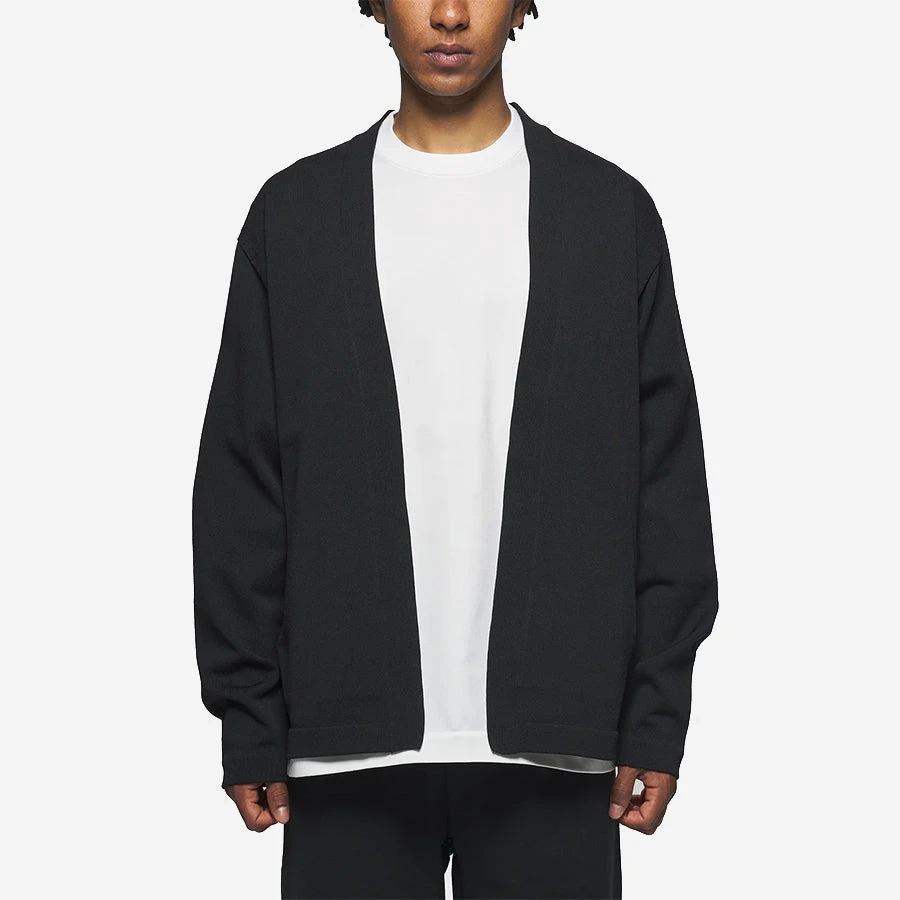 A knitted cardigan made of multi-functional material knitted with a whole-garment method. A whole garment manufacturing method creates a beautiful three-dimensional shape and a comfortable fit while wasting much less yarn. The fabric is soft, lightweight, stretchy and offers anti-pilling against scratches. The fabric offers an elegance of a high-gauge knit while achieving an appropriate thickness by knitting with 3 threads. The relaxed silhouette and simple design, without any buttons, provides a sleek look. Great for both a casual or formal look.