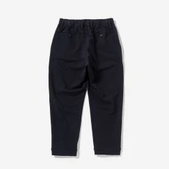 during the height of summer. Loosely fitted around the thigh area, the silhouette tapers towards the hem. The cuff on the hem are created using a tucked concealed seam that requires a highly skilled hand, and helps maintain its stylish silhouette. The rubber behind the waist makes it easy to wear while the waist expands and contracts about 4 inches.