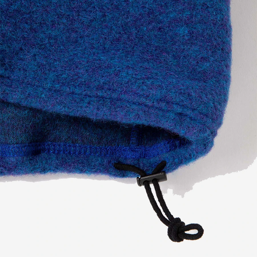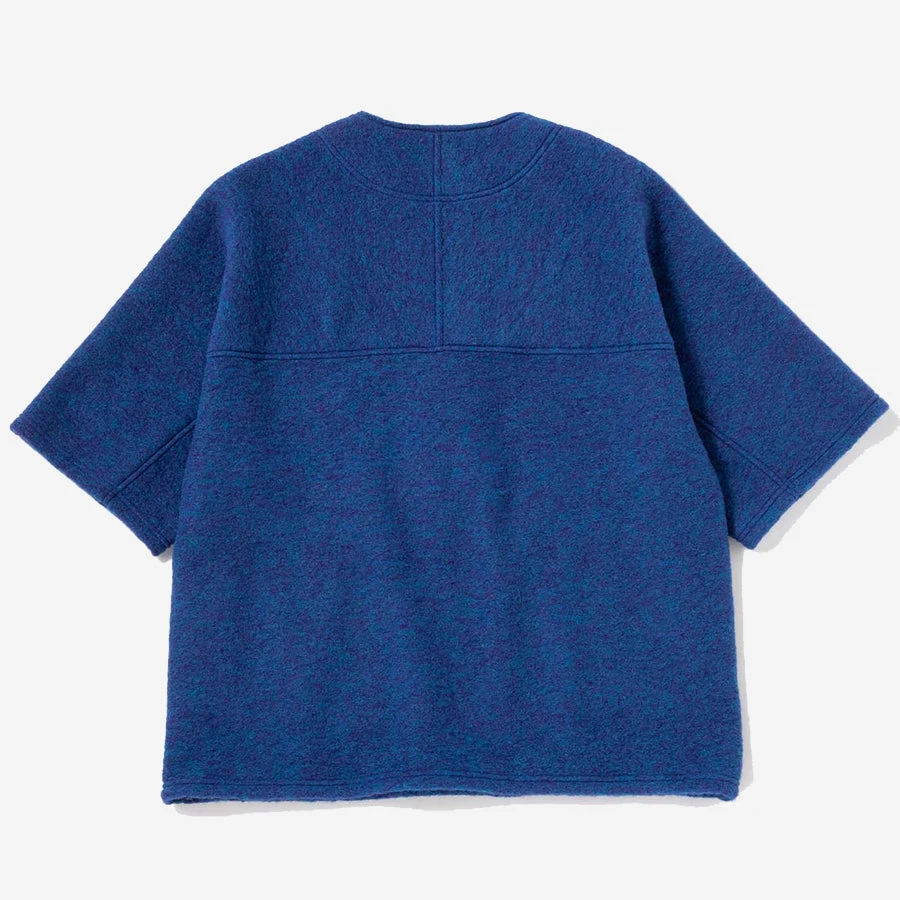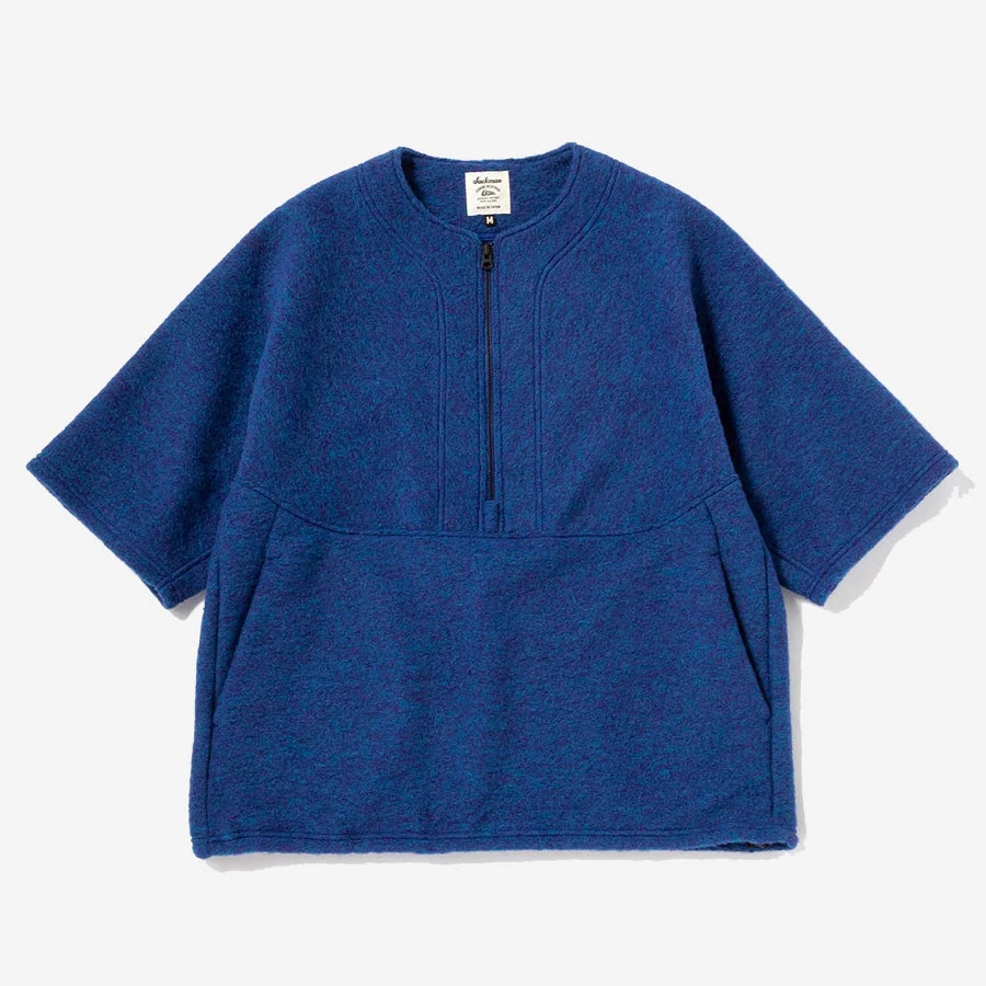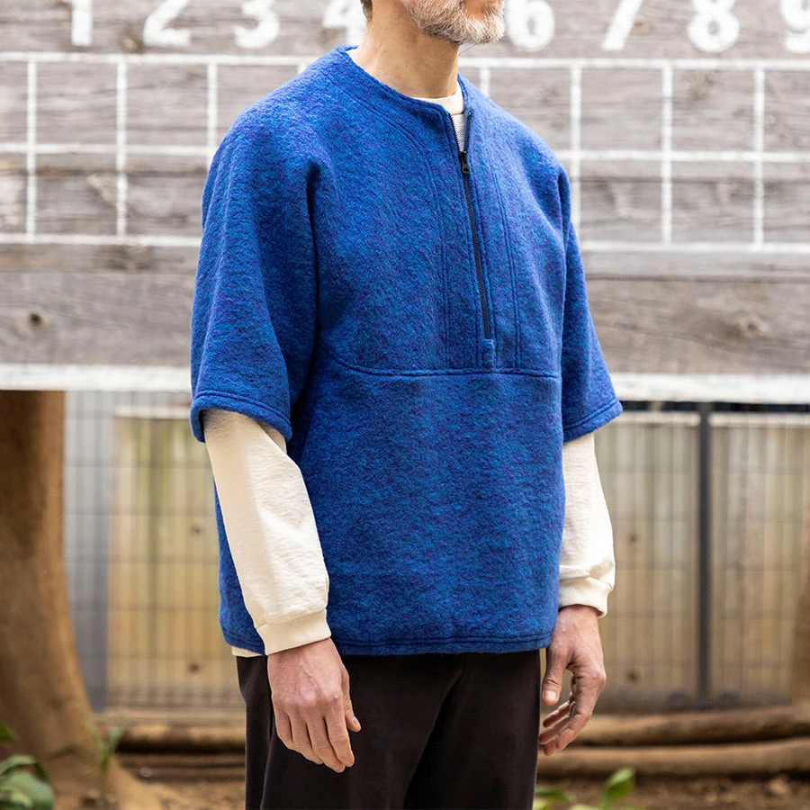 The Wool Watch Shirt is made from a blend of high-quality Shetland wool, which has excellent heat retention, and high-strength polyester, and finished with a jersey knit. Wool from the Shetland Islands in Scotland is wool from sheep that is raised in a harsh environment with severe winter cold and high humidity, and is characterized by thick and soft hair due to a special breeding environment. The yarn is loosely twisted and knitted to achieve thickness so as to keep the warm air inside the fibers. This watch shirt is designed with the image of a 1970s overshirt worn by baseball players on the bench. The loose design makes it easy to put on and take off, and the rubber spindle at the hem allows you to arrange your silhouette. Considering the use as outerwear, there are seam pockets on the sides. Not only can it be worn outdoors, but it is also recommended as a winter wear indoors or in the car.