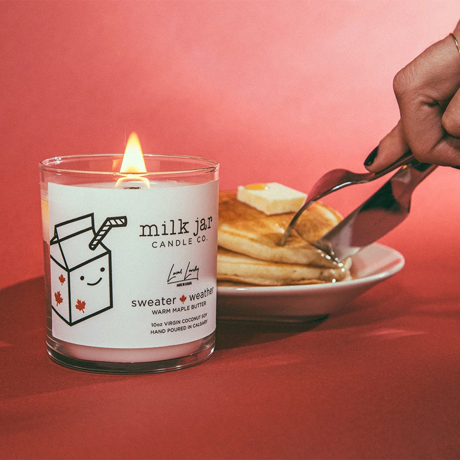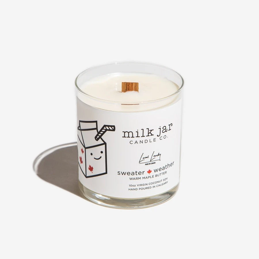 ‘Sweater Weather is a cozy candle scented with delicious maple butter that will make you want to curl up in a big comfy knit and is a representation of our beautiful country! From the iconic imagery to the incredibly yummy scent of warm maple butter, Sweater Weather is the nicest candle you will ever get to meet. Scented with phthalate-free fine fragrance oils.