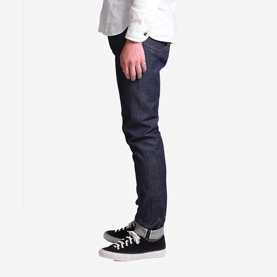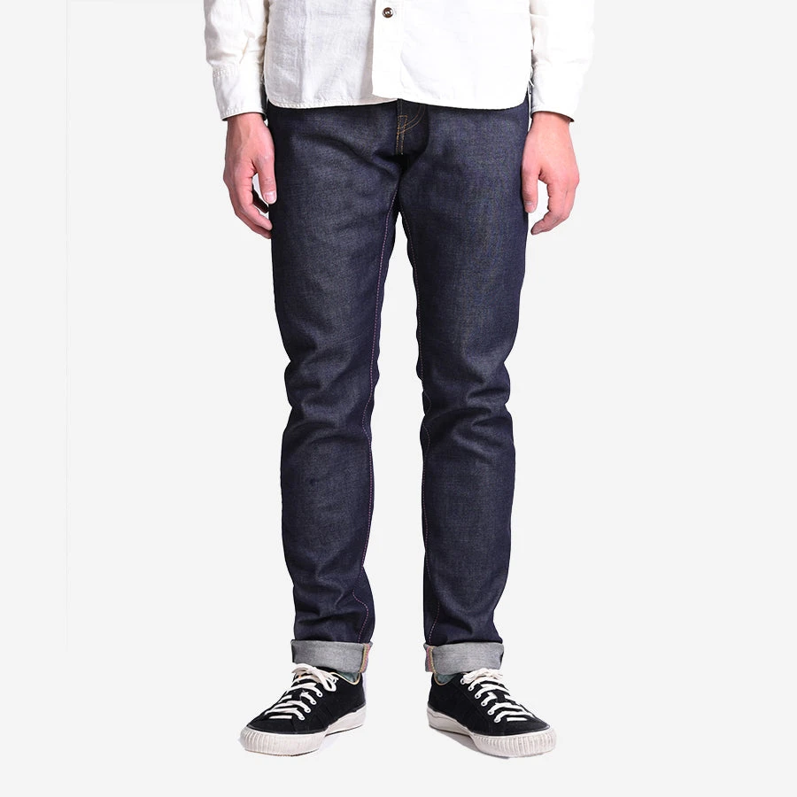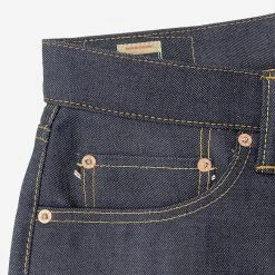 MOMOTARO’s “High Tapered” fit is a slim and tapered fit, with a medium rise, roomier medium thighs, and a strong taper throughout the leg.
