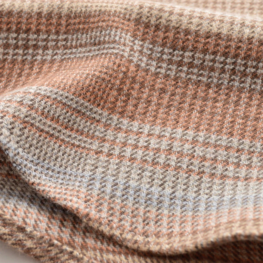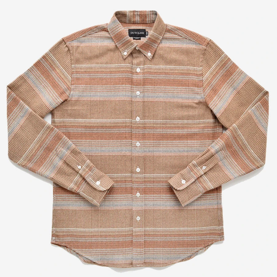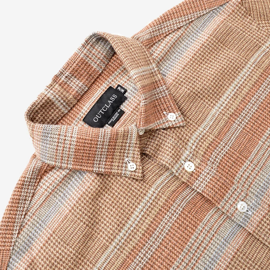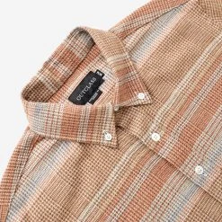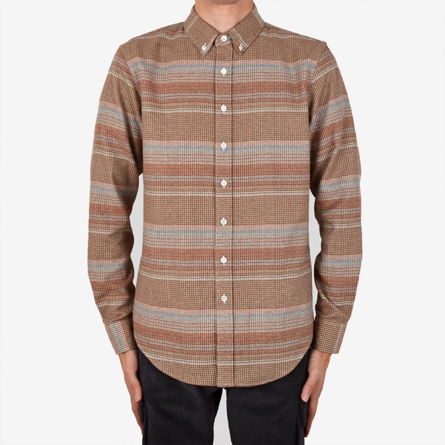 This shirt is made using a soft, Portuguese flannel fabric that features a houndโs tooth stripe pattern throughout. The shirt is constructed with double-needle seams, a button-down collar and white mother of